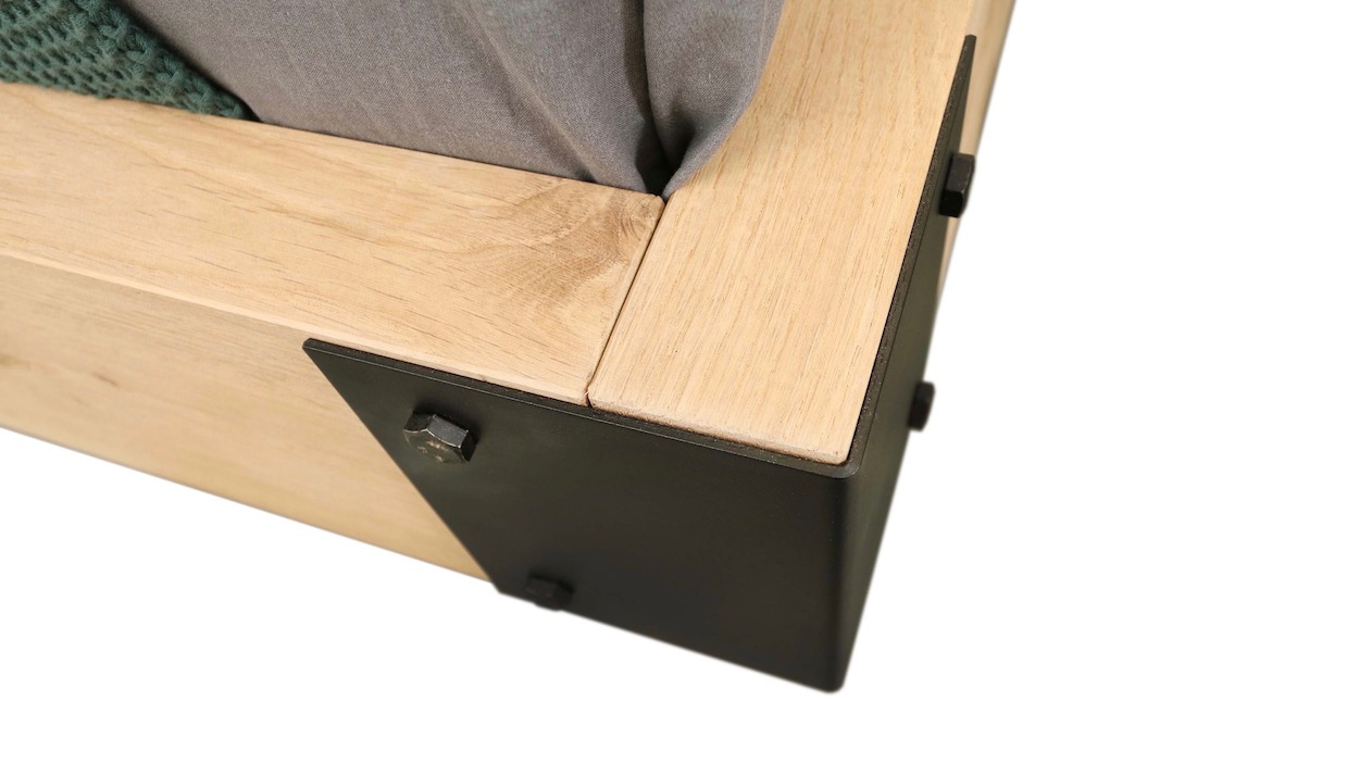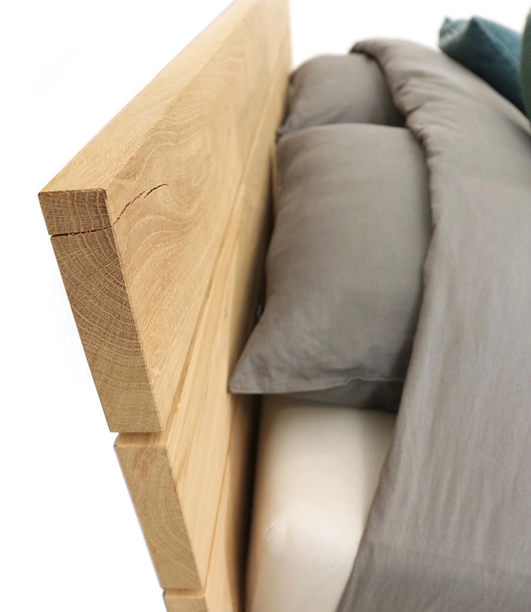 Zwevend bed gemaakt van rustiek eiken balken gecombineerd met stalen verbindingen. Rustiek eiken wil zeggen dat in het hout noestjes en scheurtjes voorkomen. Deze kenmerken geven het hout een warm en levendig karakter.