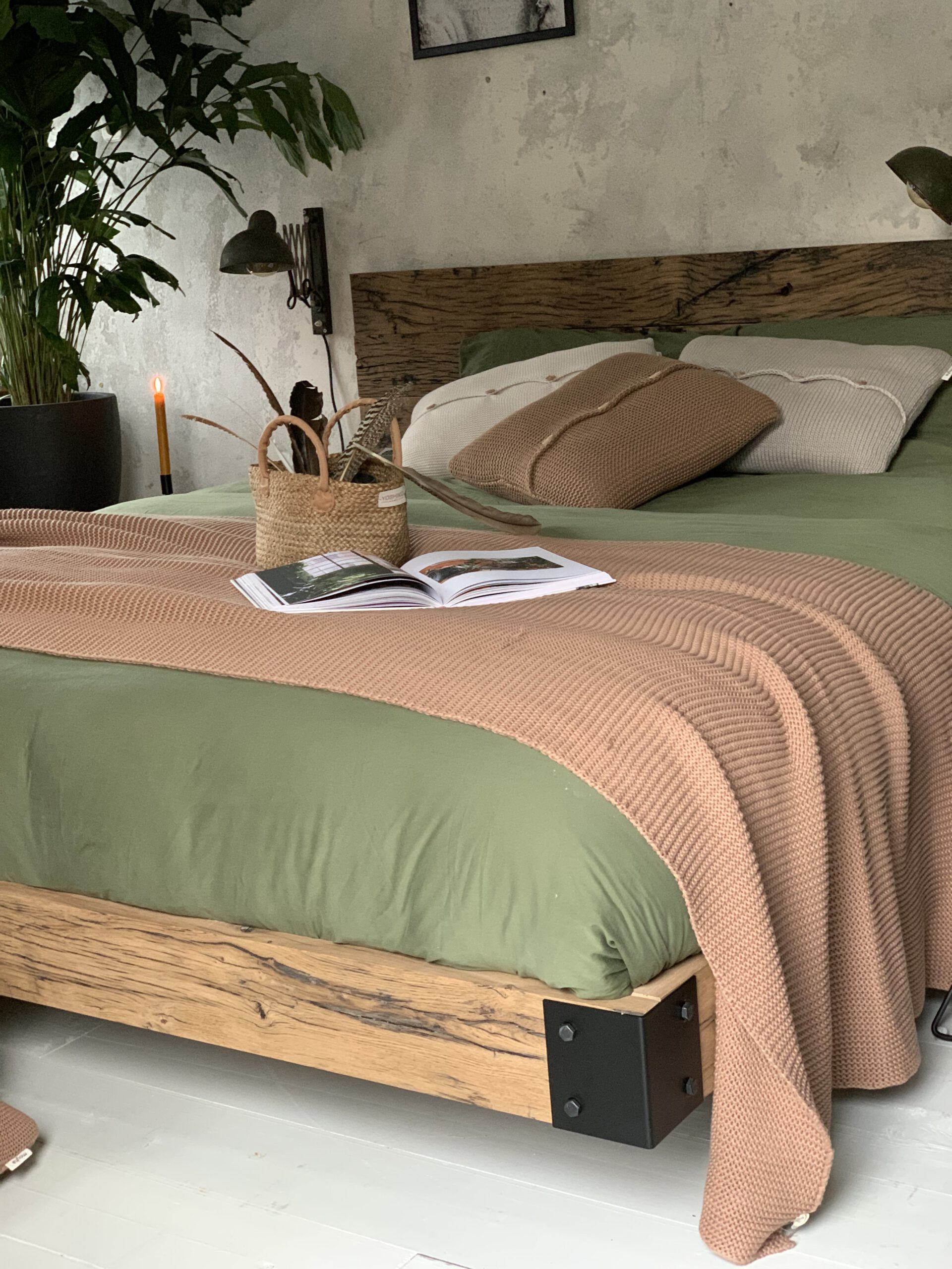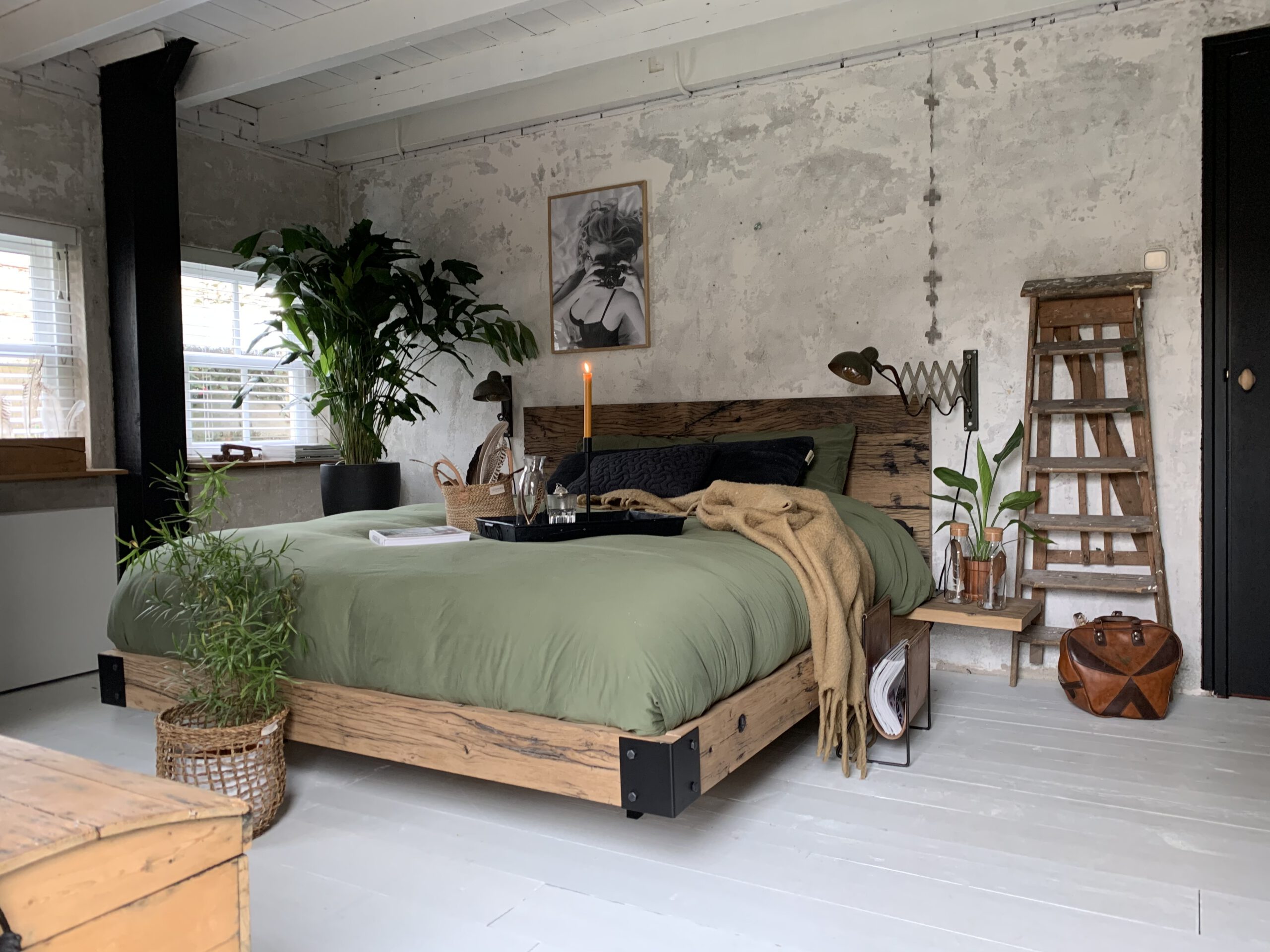 Zwevend bed gemaakt van oud eiken balken gecombineerd met stalen verbindingen. De eiken balken zijn soms wel meer dan 100 jaar oud. De sporen van de jaren in het hout geven het bed een stoer karakter. Ooit als plank gediend in een trein nu dan eindelijk zijn rust gevonden als bed. Een mooi tweede leven. De oud eiken balken worden terug geschaafd naar 4 cm dikte.