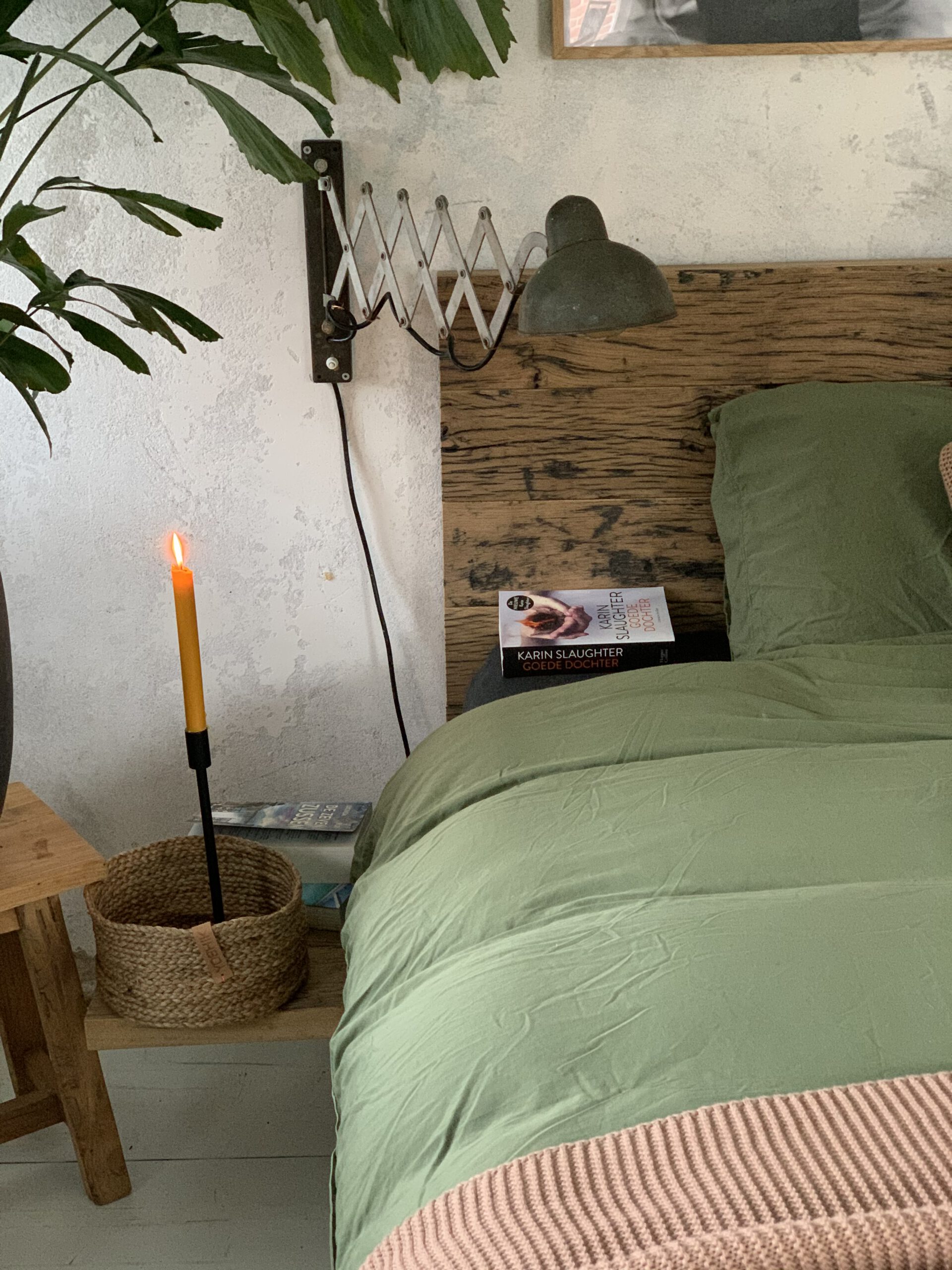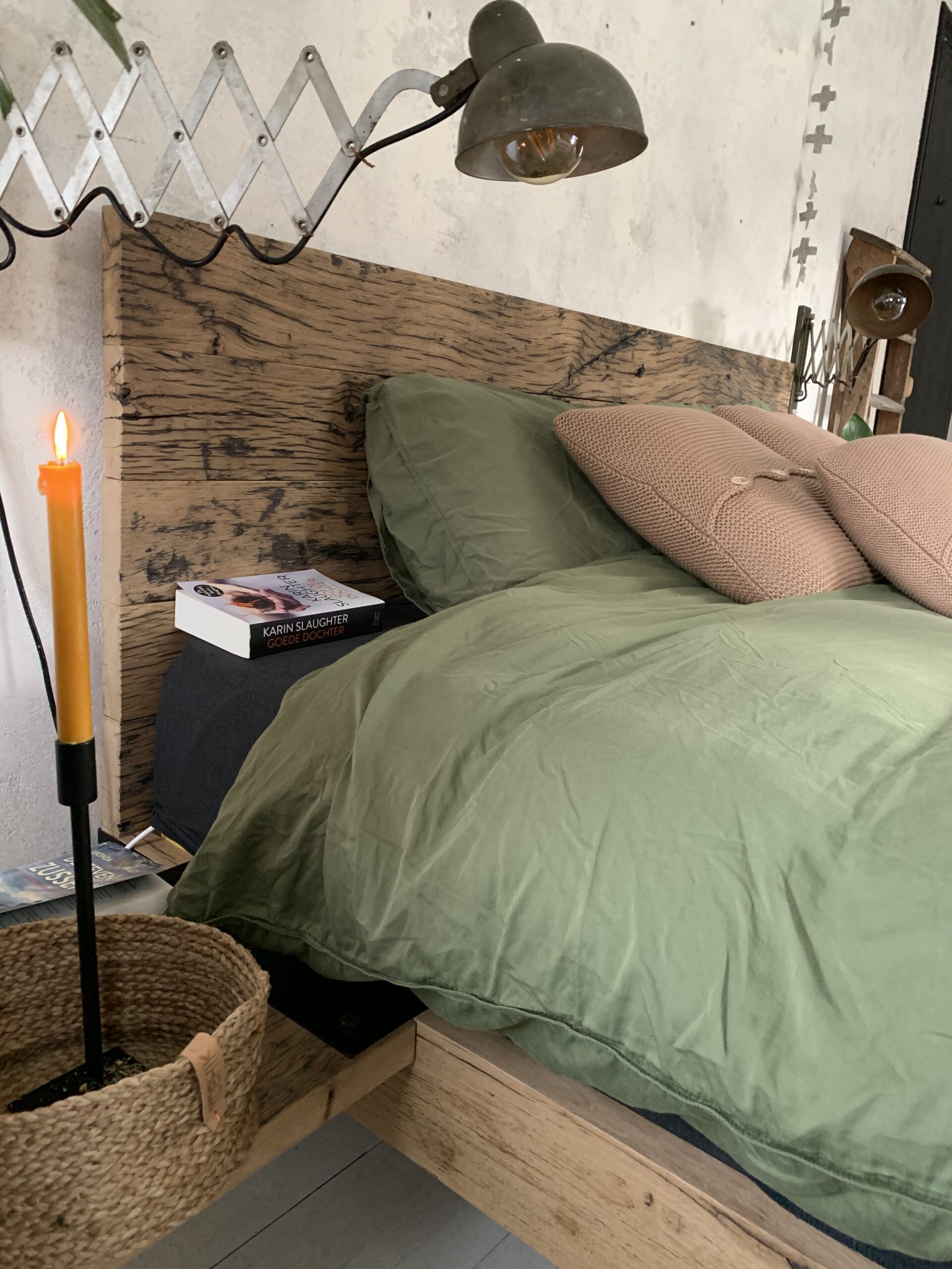 De oud eiken aanhaak nachtkastjes zijn in dezelfde stijl gemaakt als het bed. Deze nachtkastjes zijn apart bij te bestellen.