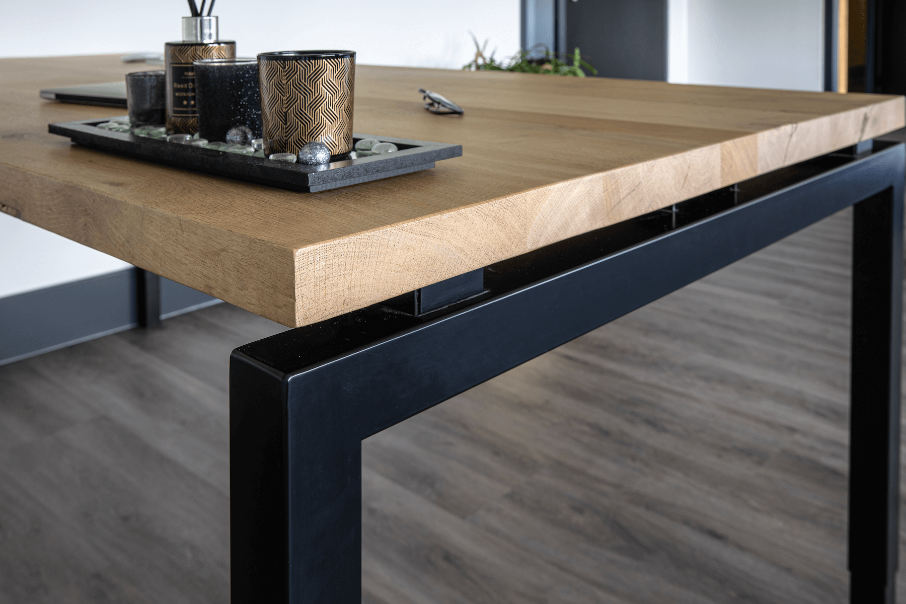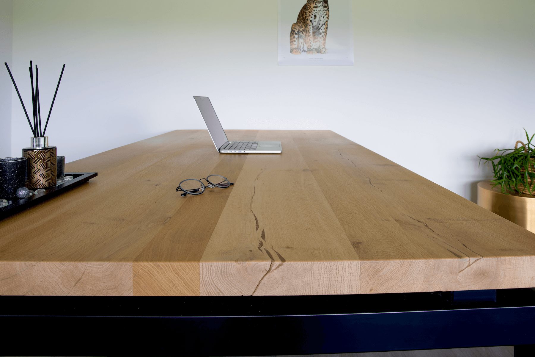 Het eiken blad is 4 cm dik en kan worden afgewerkt met een matte lak. Daarmee is het hout beschermd en blijft de oorspronkelijke kleur van het eikenhout zoveel mogelijk behouden.