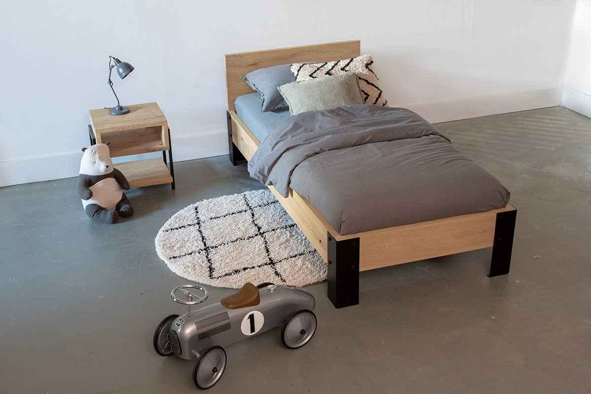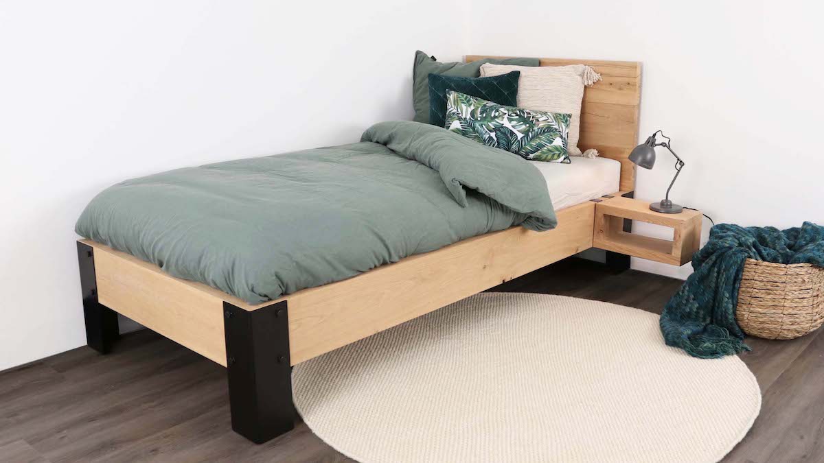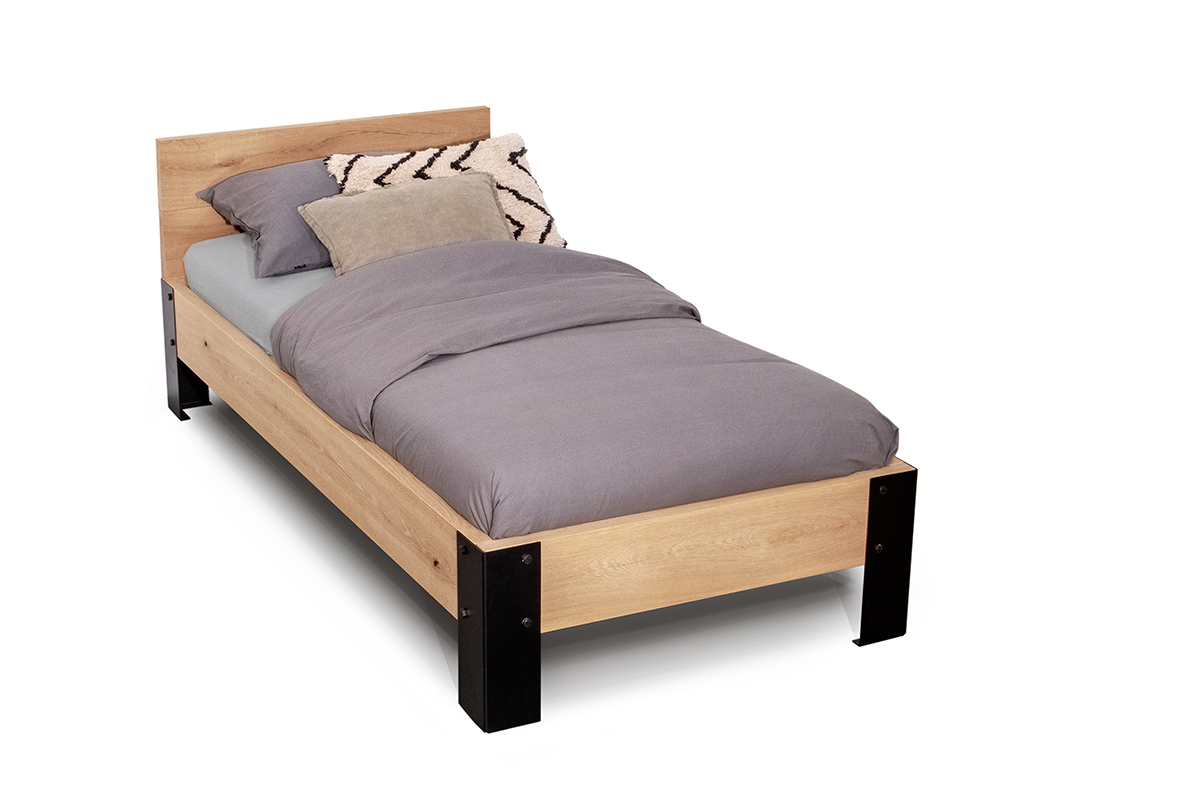 Stoer eenpersoonsbed gemaakt van massief eiken. Het bed wordt gemaakt van 52 mm dikke rustiek eiken planken die wij terug schaven naar 40 mm dikte. Rustiek eiken wil zeggen dat in het hout noestjes en scheurtjes voorkomen. Deze kenmerken van het hout geven het hout karakter. Al het hout wordt goed gecontroleerd op bruikbaarheid voor een bed ombouw. Voor een extra stoer uiterlijk hebben we gekozen voor stalen poten met een zwarte coating.