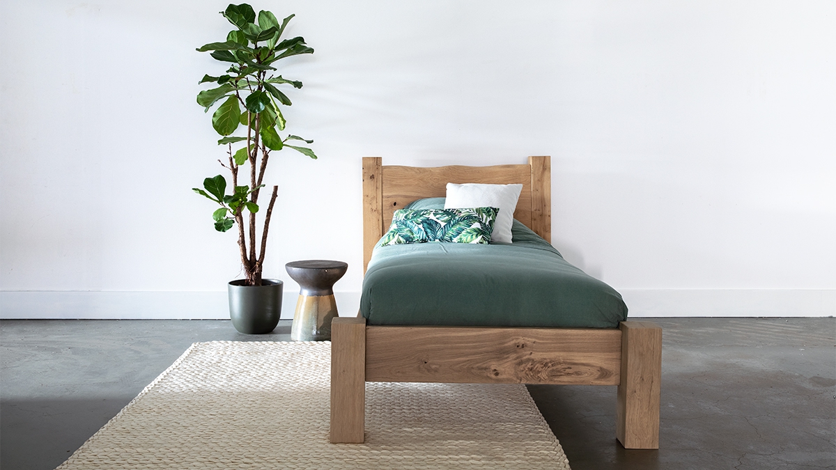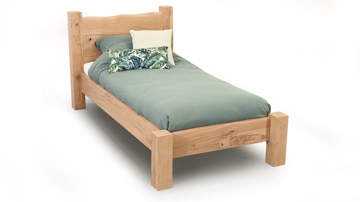 Robuust en stoer eenpersoonsbed gemaakt van massief eiken. We gebruiken hier rustiek eikenhout voor. Dat wil zeggen dat het hout scheuren en noestjes bevat, wat het juist een levendig karakter geeft.