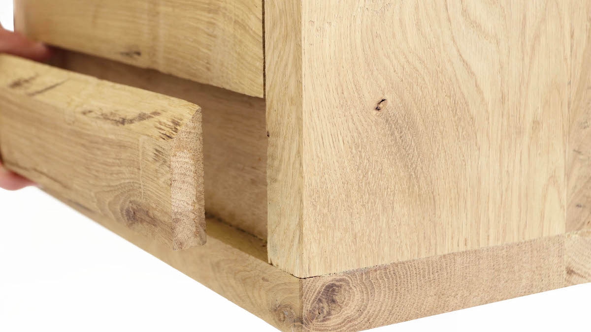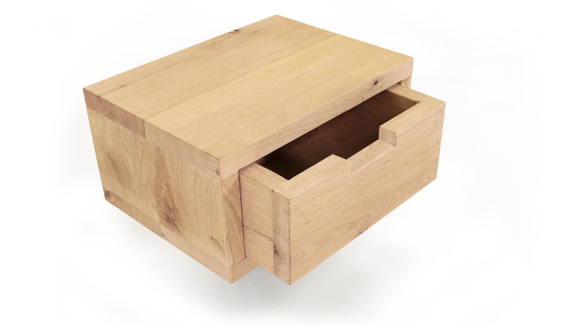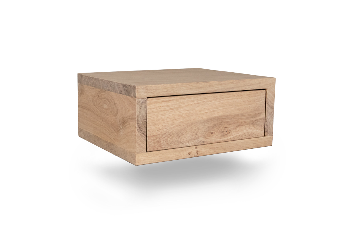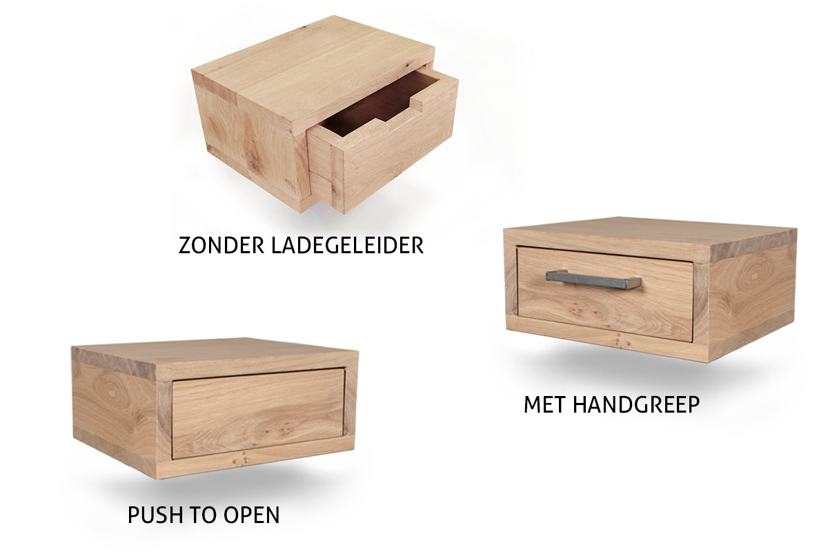 Dit eikenhouten nachtkastje kan gecombineerd worden met al onze eikenhouten bedden. Het nachtkastje wordt door middel van een lat aan de muur bevestigd. Het nachtkastje is leverbaar met en zonder ladegeleiders. Het nachtkastje zonder ladegeleiders heeft een uitsparing in het hout als handgreep. Bij het nachtkastje met ladegeleiders kun je kiezen uit een stalen handgreep of push-to-open systeem.