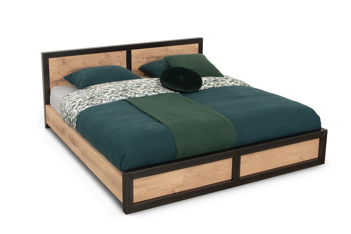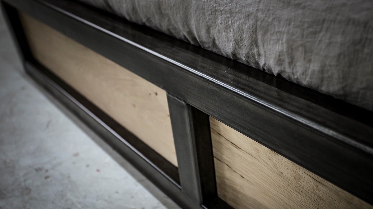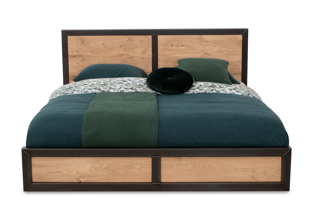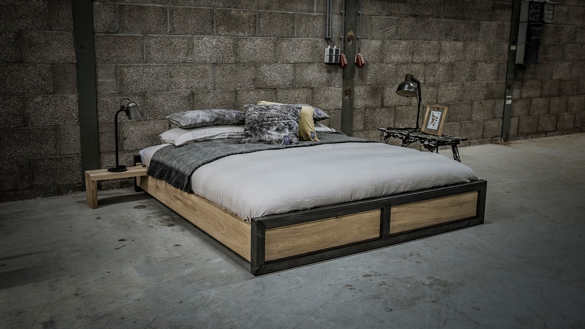 Stoer industrieel bed gemaakt van 4 cm dik rustiek eiken gecombineerd met een stalen frame aan voor en achterzijde. Rustiek eiken wil zeggen dat het hout noestjes en scheuren kan bevatten. Juist dit hout heeft zoveel meer uitstraling. Het staal is afgewerkt met een blanke coating. Je ziet de oneffenheden in het staal wat het stoere karakter geeft.