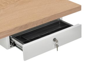 Deze lade is perfect bij onze zit-sta bureau’s! Doordat je de lade aan het blad bevestigd zit, gaat hij mee omhoog en omlaag. Zo zit de lade altijd op de juiste hoogte.
