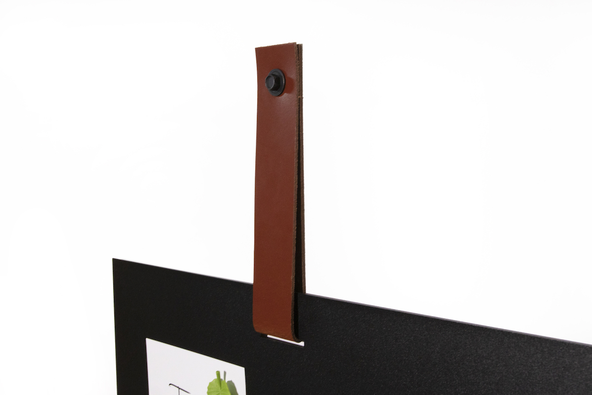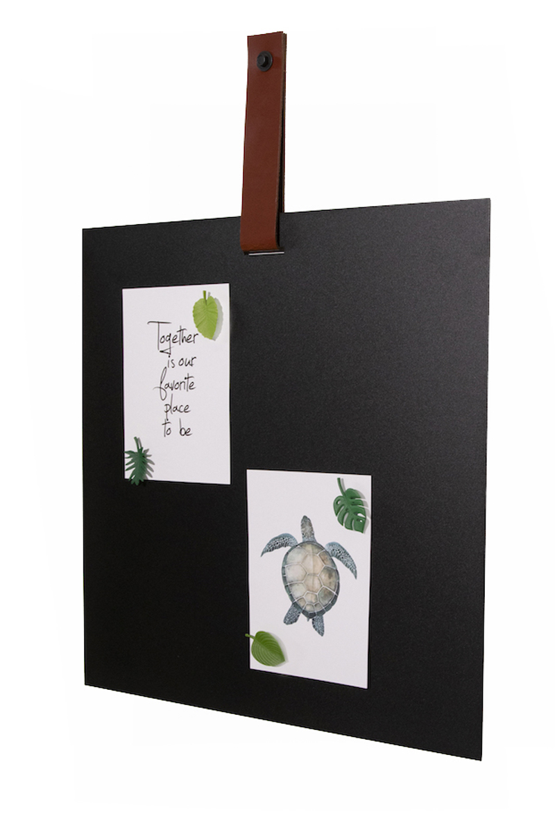 Mooi vierkant magneetbord in met leren band. Het magneetbord is uitgevoerd in staal en afgewerkt met een zwarte coating. De leren band is in cognac kleur. Het leer in combinatie met staal geeft een stoere en ruige uitstraling. De afmetingen van het magneetbord zijn 45×45 cm.
