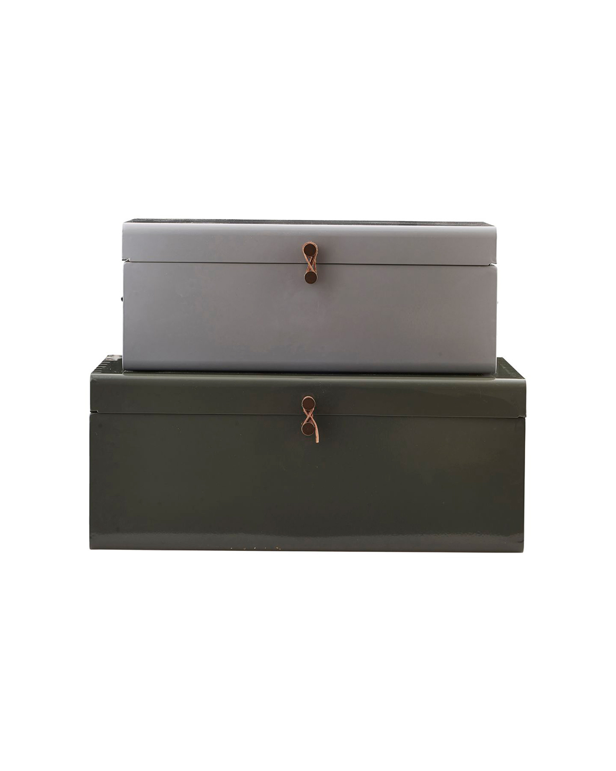 Het grootste, tevens het onderste koffertje, heeft een mooie warme donkergroene kleur. Het kleinere koffertje heeft een elegante lichtgrijze kleur. Deze speling tussen de warme en koude kleuren van de koffertjes zorgen voor een mooi contrast. De kleine leren bandjes aan de voorzijden zorgen ervoor dat de koffertjes netjes gesloten blijven.