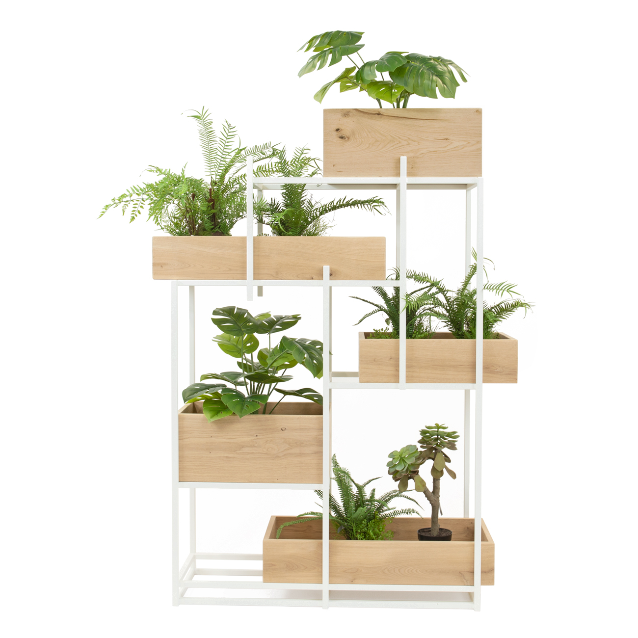 De roomdivider is een ware eye-catcher in de ruimte. Dat komt door het solide stalen frame, met daarin de massief eiken plantenbakken die we hebben geplaatst. De hoogteverschillen creëren een speels element, terwijl je daar bovendien heel functioneel gebruik van kunt maken.