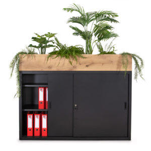 Je kunt de kantoorkast inrichten met allerlei planten. Zowel kunstplanten als echte planten.