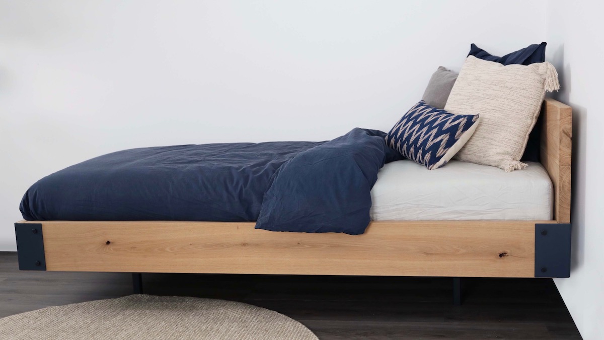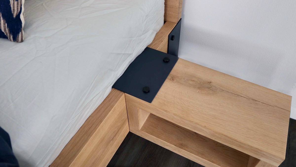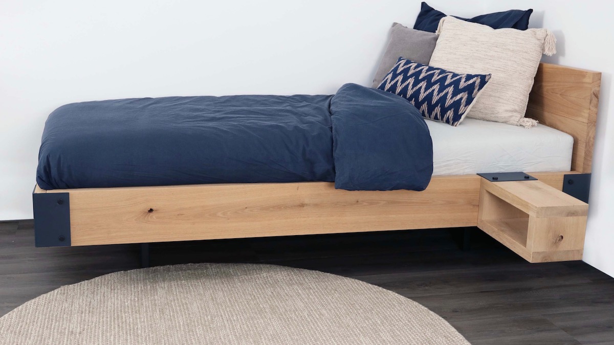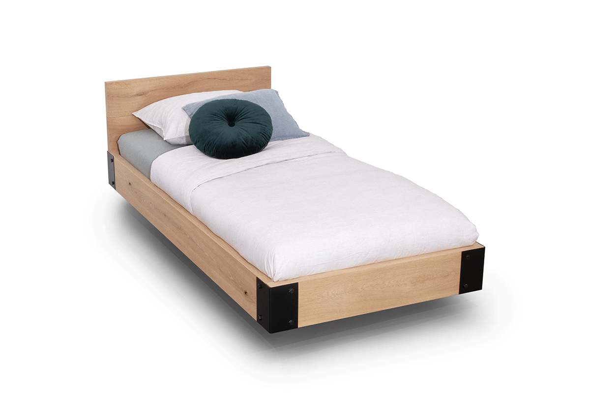 Zwevend eenpersoonsbed gemaakt van massief eiken gecombineerd met stalen verbindingen. Een heerlijk bed dat er ook nog geweldig uitziet. Het bed wordt gemaakt van 52 mm dikke rustiek eiken planken die wij terug schaven naar 40 mm dikte. Rustiek eiken wil zeggen dat in het hout noestjes en scheurtjes voorkomen. Deze kenmerken van het hout geven het hout karakter. Al het hout wordt goed gecontroleerd op bruikbaarheid voor een bed ombouw. Voor een extra stoer uiterlijk hebben we gekozen voor stalen hoekprofielen met een zwarte coating. Het bed wordt geleverd exclusief lattenbodem en nachtkastje. Deze zijn los bij te bestellen.