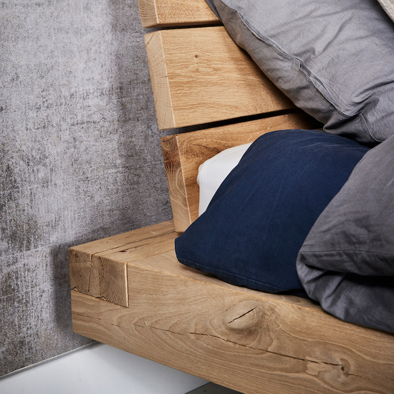 Het eiken bed is optioneel leverbaar met een massief eiken hoofdbord (zoals afgebeeld). Het hoofdbord is opgebouwd uit drie eiken planken van maar liefst 4 cm dik en staat iets schuin naar achteren geplaatst. De totale hoogte met hoofdbord vanaf de grond gemeten wordt dan 83 cm.