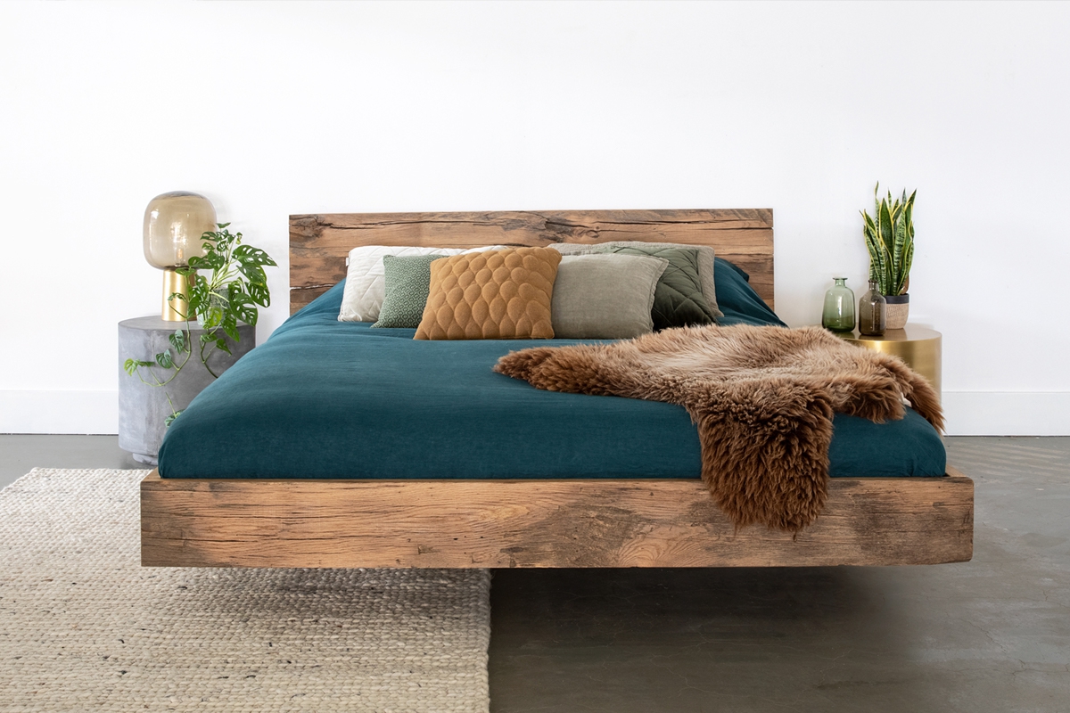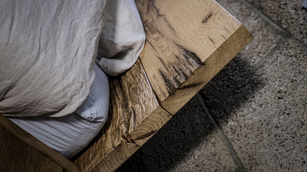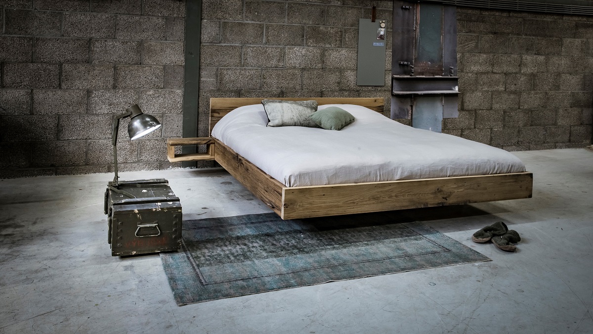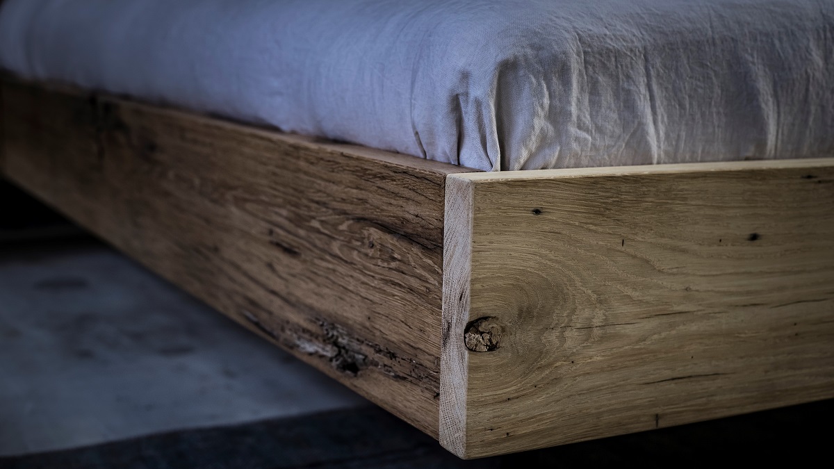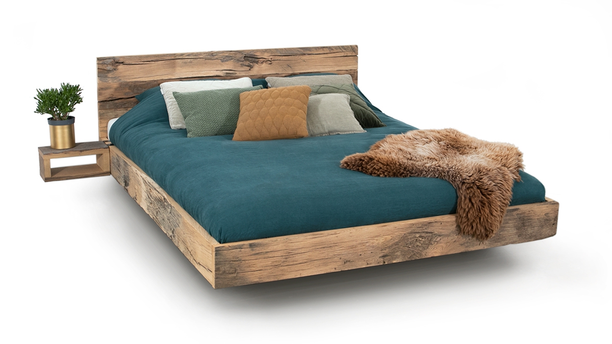 Zwevend bed gemaakt van oud eikenhouten planken. De eiken balken zijn meer dan 200 jaar oud. Zeer bijzonder eiken hout. De sporen van de jaren in het hout geven het bed een stoer karakter. Ooit als schuur, door weer in wind in de Oostenrijkse bergen, nu dan eindelijk zijn rust gevonden als bed. Een mooi tweede leven. De oud eiken balken worden terug geschaafd naar 4 cm dikte. Het verweerde in het hout blijft mooi zichtbaar.
